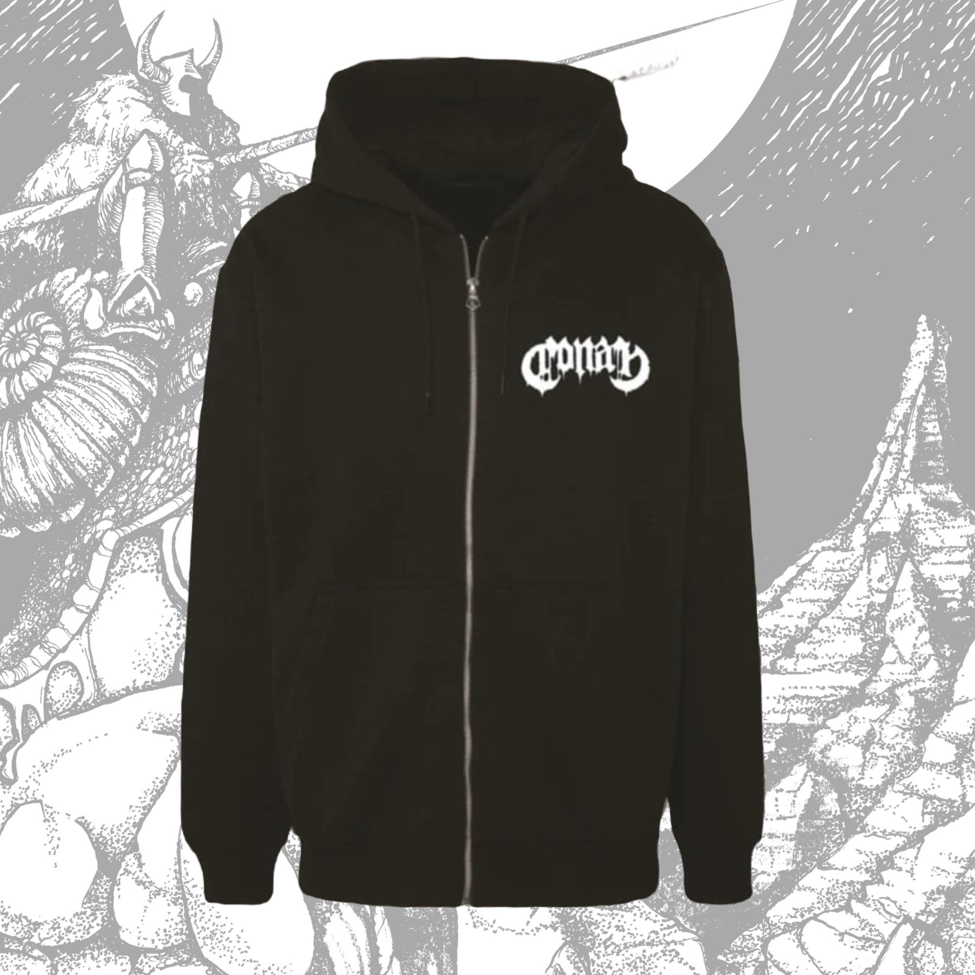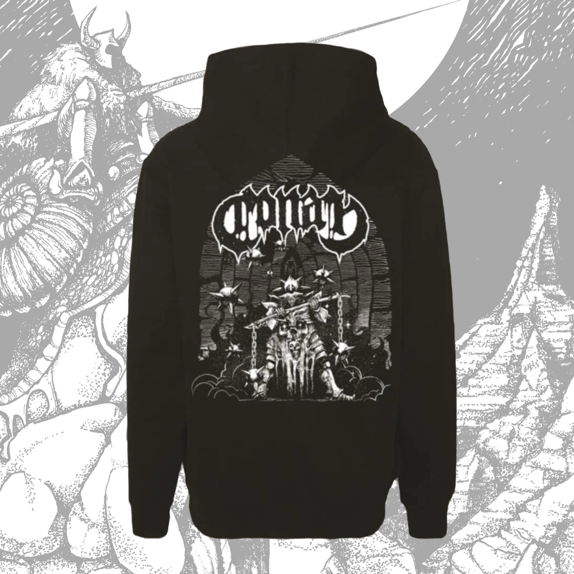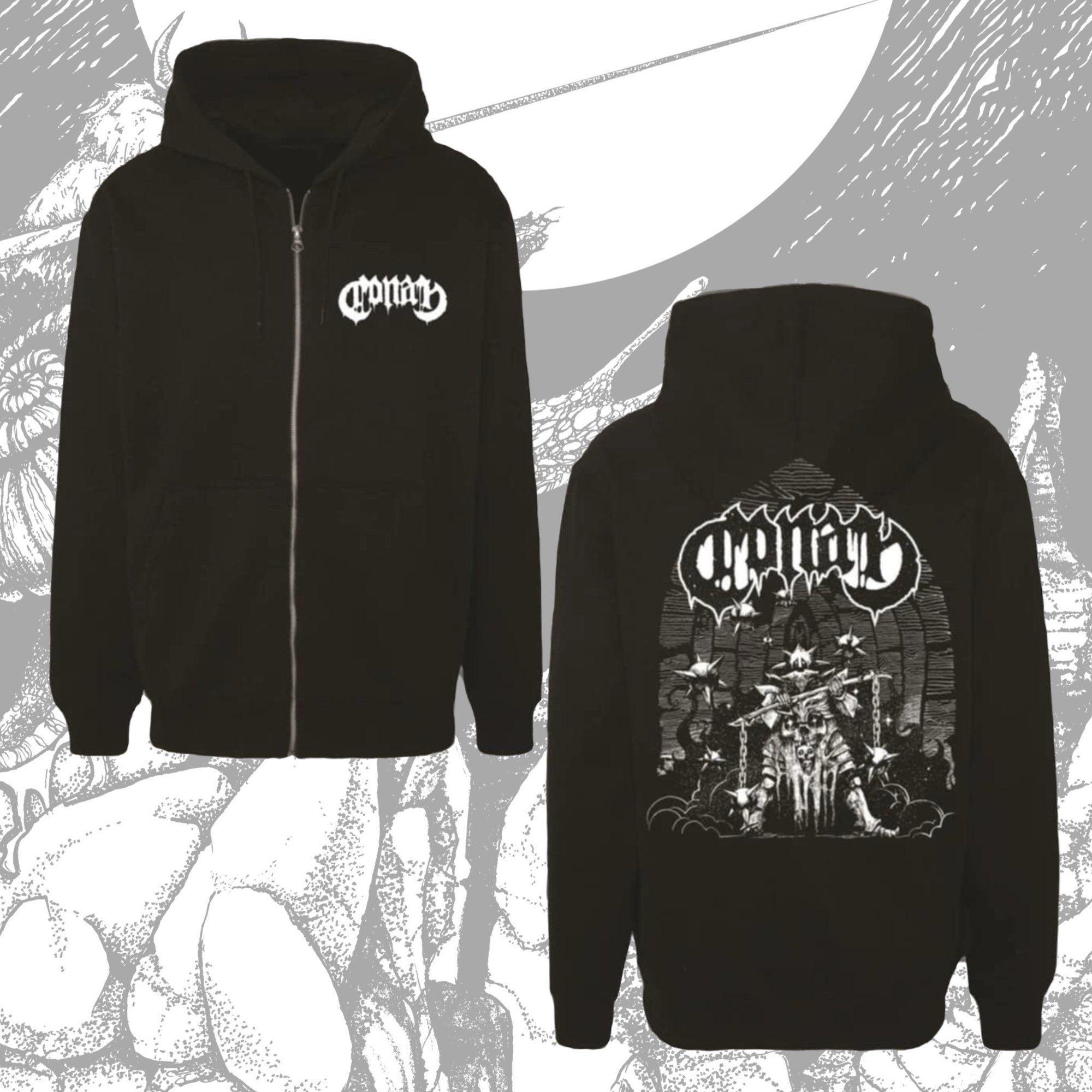 Fire and Death zip up hoodie. Left chest and back print with white ink.