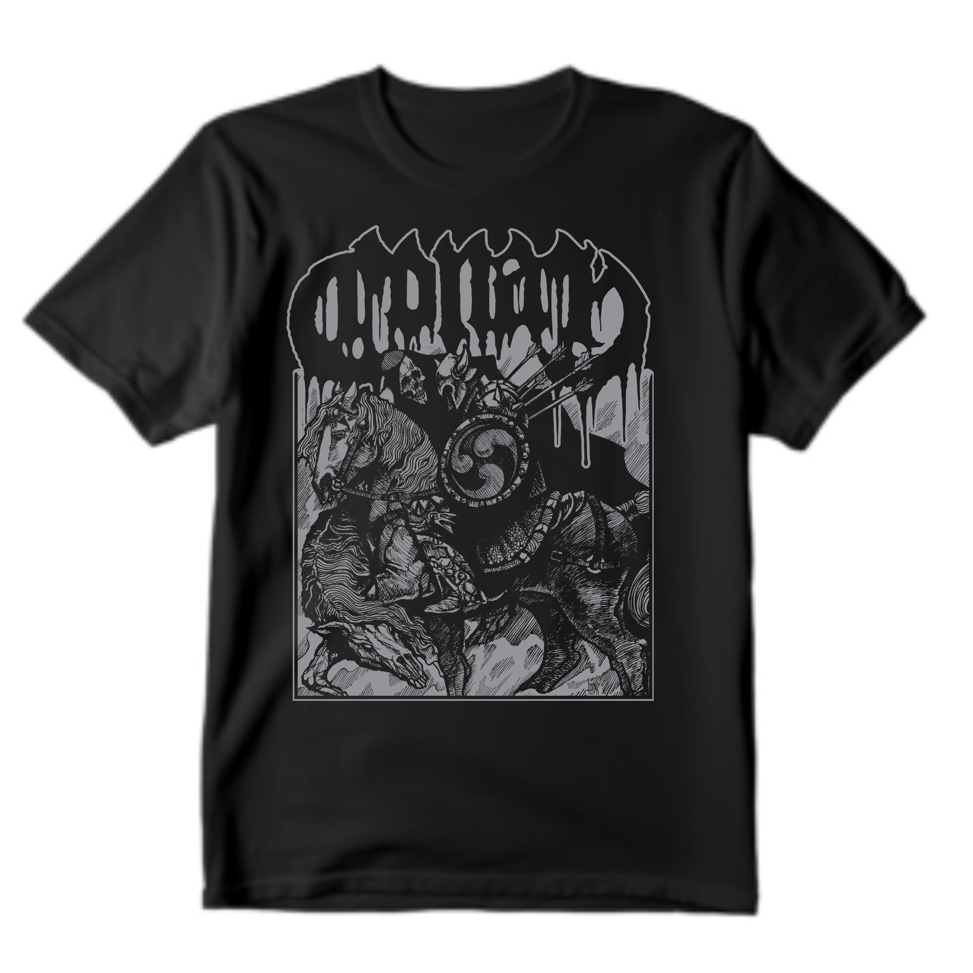 Horse back battle hammer black short sleeve tees Printed on the highest quality blanks, Comfort Colors C1717 Metallic silver print on the front